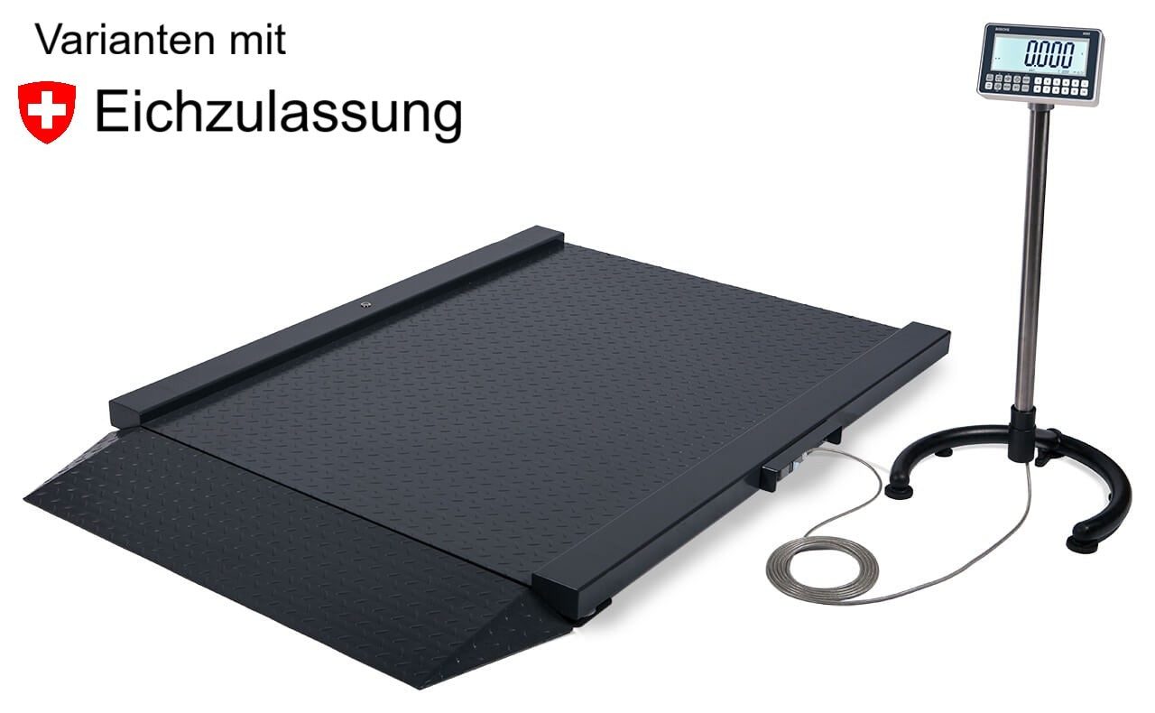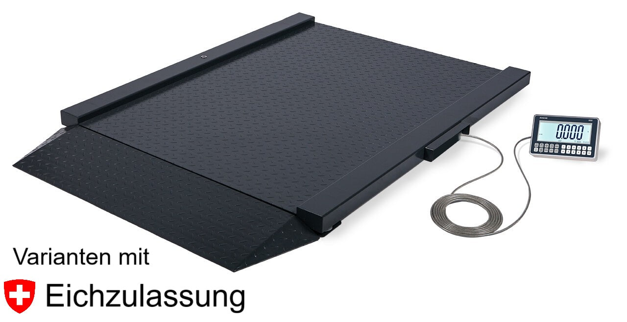 Eine Durchfahrwaage ist eine flache Plattformwaage mit integrierten Auffahrrampen. Sie ermöglicht das Wiegen von Paletten, Rollwagen oder Containern, ohne dass diese angehoben oder umgeladen werden müssen – das Wägegut kann einfach auf- und abfahren oder komplett durchfahren. Durchfahrwaagen haben eine sehr flache Bauweise und seitliche Auffahrrampen, wodurch das Be- und Entladen besonders einfach ist. Sie ermöglichen schnelles, ergonomisches Arbeiten, sind robust konstruiert und eignen sich ideal für Bereiche mit hohem Warenumschlag, in denen ohne Umlagerung gewogen werden soll. Je nach Ausführung decken die Durchfahrwaagen Tragkräfte bis 3 000 kg ab. Typische Plattformgrössen sind z. B. 1000 × 1500 mm. Weitere Grössen und Sonderabmessungen sind auf Anfrage möglich, wenn Sie spezielle Anforderungen an Fläche oder Wägebereich haben. Die Durchfahrwaagen sind je nach Modell aus lackiertem Stahl oder aus Edelstahl gefertigt. Edelstahl-Ausführungen eignen sich besonders für anspruchsvolle oder hygienisch sensible Umgebungen, etwa in Lebensmittelbetrieben. Alle Kabel und Wägezellen sind geschützt im Rahmen verlegt, was die Lebensdauer erhöht. Ja, viele Durchfahrwaagen sind nach Schweizer Vorgaben eichfähig und für eichpflichtige Anwendungen geeignet. In der Produktbeschreibung ist jeweils klar ersichtlich, ob es sich um eine eichfähige bzw. geeichte Ausführung handelt oder um eine Waage für interne Kontrollwägungen. Standardmodelle sind in der Regel ab Lager verfügbar und werden innerhalb von 2–3 Tagen geliefert. Ab einem Bestellwert von 400 CHF erfolgt die Lieferung innerhalb der Schweiz versandkostenfrei. Durchfahrwaagen werden vor allem in Logistikzentren, Produktionslinien und Lebensmittelbetrieben eingesetzt. Überall dort, wo Paletten, Rollwagen oder Container schnell und ohne Umlagerung gewogen werden sollen, spielen sie ihre Stärken aus. Ja, je nach Modell sind Anpassungen bei Tragkraft, Plattformgrösse, Materialausführung, Anzahl Rampen und Auswertegerät möglich. Auf Wunsch beraten wir Sie persönlich und prüfen Sonderlösungen, damit die Durchfahrwaage optimal zu Ihren Prozessen passt. Häufig gestellte Fragen zu Durchfahrwaagen